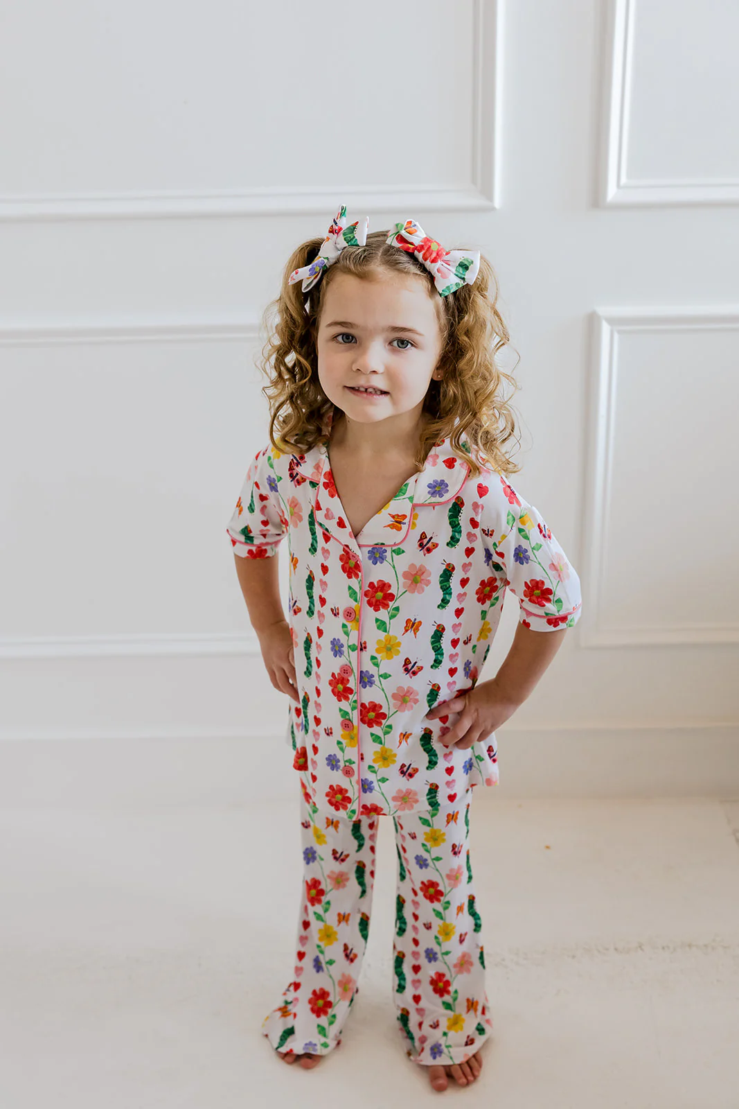 The Lovebug Blooms Dream Girl’s Flare Set is a cheerful blend of comfort and charm. Part of the DBLC x World of Eric Carle collaboration, this whimsical print features blooming florals, hearts, fluttering butterflies, and the beloved hungry caterpillar for a joyful, storybook-inspired look. Crafted from our signature buttery-soft bamboo fabric, this two-piece set is perfect for lounging, play, and matching moments.